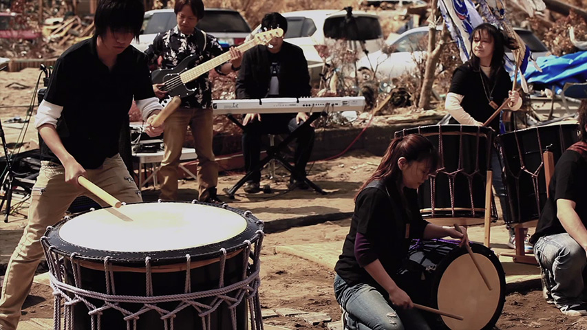 The ensemble we see in the film, M’s Japan Orchestra, is part of a bigger group of musicians called 3D Factory that is based in Tohoku. Their producer, Shu Chiba, factors into the story of Kento Ito and his family, and he and the rest of 3D Factory helped Kento organize the koi-nobori ceremony seen in the film. Their music is also heard on the soundtrack of the film; and Shinya Mizoguchi adapted themes from their music as motifs in the film score. Their music is a fusion of elements of Jazz, Progressive Rock and even modern Western classical music with elements of Japanese traditional music.