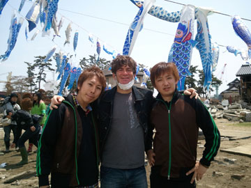 After 3 weeks, Waki-san needed to return to Tokyo, and Stu hired a local college student, who had lost his home, to work with him. Hiromi Ujiie, or “Uji-kun” for short, had never operated sound equipment, but offering even a short-term job to a local victim was a priority to Stu. Waki-san trained Uji-kun before he left and the combo of Stu/Uji took over. Stu learned a lot from Uji-kun about the local perspective on things and they built a strong senpai-kohai (cross between “older brother-younger brother” and “mentor-mentee”) relationship.
